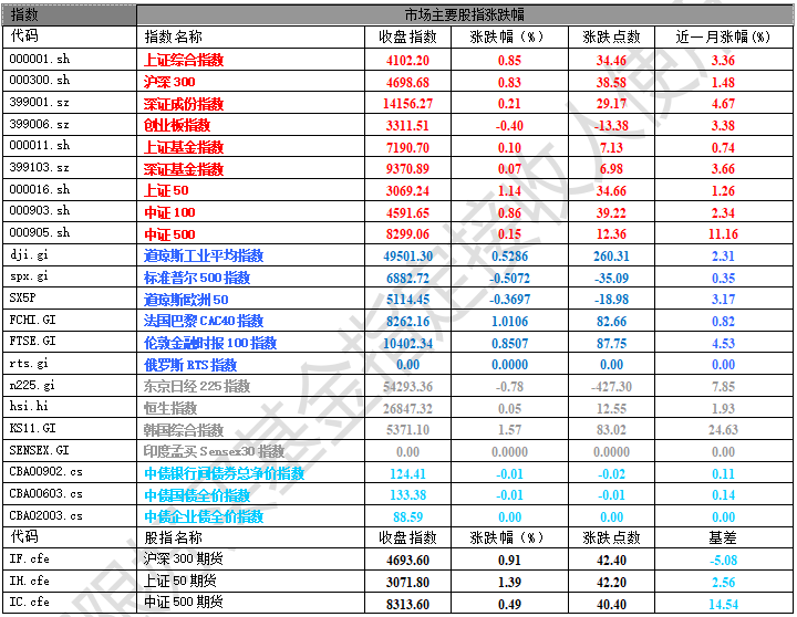 31個申萬一級行業(yè)中有27個行業(yè)上漲。其中,煤炭、建筑材料、房地產(chǎn)表現(xiàn)居前,漲跌幅分別為7.58%、3.48%、2.97%,計(jì)算機(jī)、通信、傳媒表現(xiàn)居后,漲跌幅分別為-1.70%、-2.73%、-3.12%。滬市有1450只個數(shù)上漲,占比61.86%,深市有1730只個數(shù)上漲,占比59.23%。非ST個股中,36只個股漲停,10只個股跌停。股指期貨主力合約漲跌不一,其中,0只期指好于現(xiàn)貨指數(shù)。